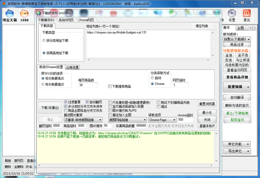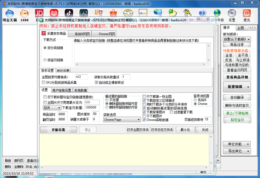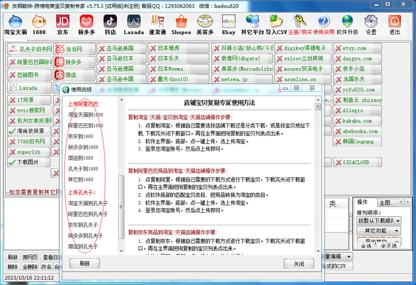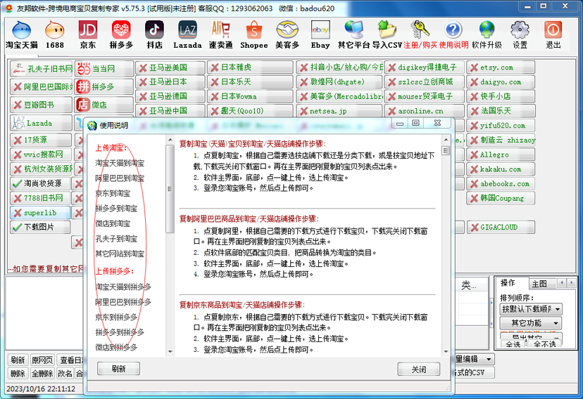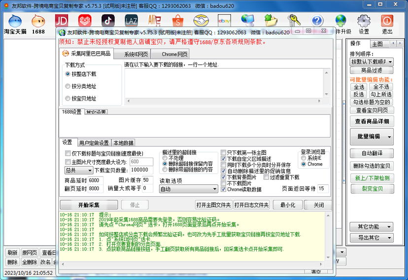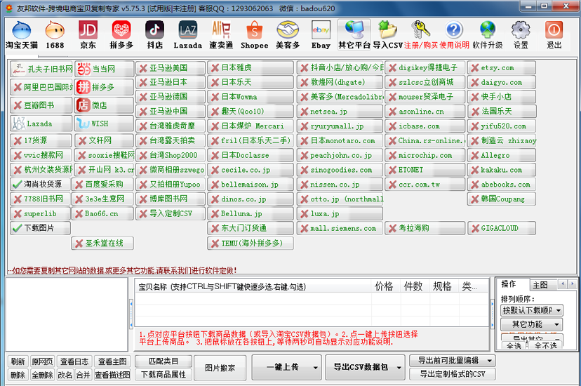 淘宝、阿里、京东、拼多多、微店、孔夫子等电商平台宝贝上传到淘宝! 淘宝天猫、阿里、京东、拼多多、微店等电商平台宝贝上传到拼多多! 淘宝、天猫、阿里、京东、拼多多、微店、孔夫子等电商平台宝贝上传到1688 ! 淘宝天猫、阿里、京东、拼多多、微店等电商平台宝贝上传到孔夫子! 抖店、LAZADA、速卖通、Shopee、美客多 、Ebay 等电商平台功能亦可开通,功能强大、技术支撑有力! 为节省下载时间,请加客服传送软件包谢谢! 点击下载友邦电商宝贝复制软件(所有文件 解压到一个文件夹即可运行)