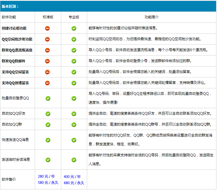 开通标准版只可以用加QQ好友、发QQ信息、发群、加群、发单个群成员功能。(软件标签排前五个功能) |